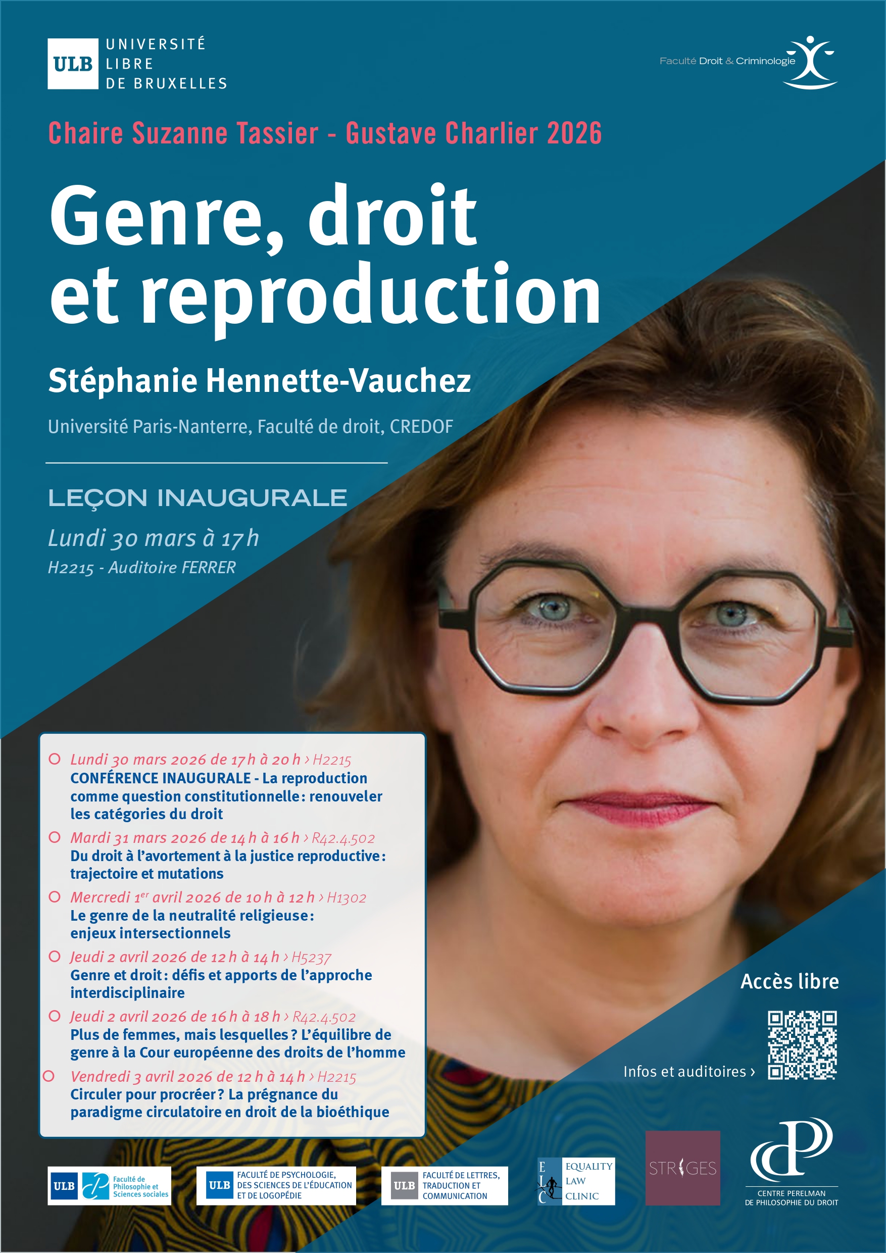 La Faculté de droit et de criminologie a le grand plaisir d’annoncer que la Chaire Suzanne Tassier – Gustave Charlier 2025-2026 a été décernée à la professeure Stéphanie Hennette-Vauchez. Professeure de droit public, directrice du Centre de recherches et d’études sur les droits fondamentaux (CREDOF) de l’Université Paris-Nanterre et membre senior de l’Institut universitaire de France, elle est une figure majeure de la recherche contemporaine sur les droits fondamentaux, l’égalité et le genre. Ses travaux, largement reconnus sur le plan international, portent aussi sur les processus d’érosion des libertés dans les démocraties contemporaines. À l’invitation de la professeure Isabelle Rorive, elle dispensera un cycle de conférences consacré aux thématiques de Genre, droit et reproduction, du 20 mars au 3 avril 2026.