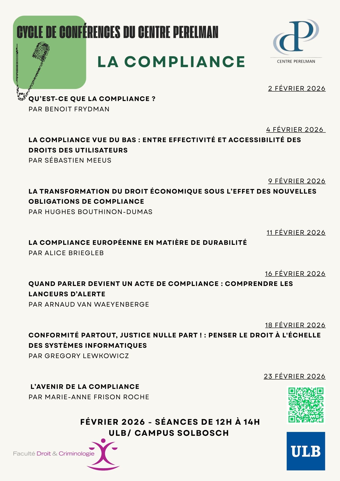Le Centre Perelman organise un cycle de conférences sur la compliance au mois de février 2026 les lundis et mercredis… -